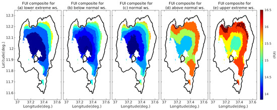 FUI composites over Lake Tana computed from FUI data belonging to the periods of below normal, normal, above normal, lower extreme, and upper extreme values of wind speed.