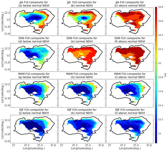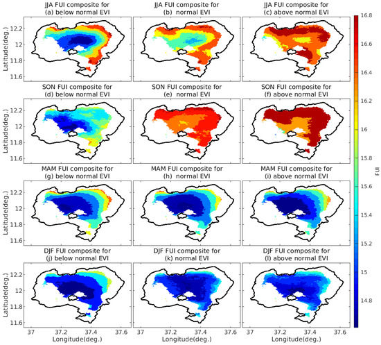 The seasonal FUI composites under different vegetation conditions (below normal, normal, and above normal NDVI and EVI values) during JJA, SON, MAM and DJF are given in (Figure 12 and Figure 13). During the summer season (JJA), the composite map shows FUI increases with increasing NDVI (Figure 12a–c) and EVI (Figure 13a–c) values. This is due to the increment of the load of non-point source(s) (NPS), such as total nitrogen (TN) and total phosphorus (TP) from high vegetation coverage linked to agricultural activities. Figure 12a and Figure 13a show that FUI is low at the center of the lake and it increases outward from the center of the lake during below-normal vegetation conditions (low NDVI and EVI values). This can be explained by the association between low vegetation coverage and the low production of TP and TN by non-point sources. During the period of low vegetation, the supply of nutrients from NPS to the center of the lake will be depleted with distance from NPS. In contrast, during normal and above-normal vegetation conditions, the FUI of the lake increased because of the increasing production of TP and TN from farmlands in the summer season (Figure 12b,c and Figure 13b,c). On the other hand, in the autumn season (SON), the FUI composite shows that the lake was very turbid during all vegetation conditions (low, normal, and above normal NDVI and EVI values) (Figure 12d–f) and (Figure 13d–f). This might indicate that the concentration of TN and TP is highest during autumn on the surface of the lake. This result is in agreement with the studies of [109,110], which have revealed the concentrations of Nitrate nitrogen (NN) and TP in the autumn season were significantly higher than its concentration in summer. In autumn, the vegetation coverage of the study area is usually very high, so the production of TP and TN from farmlands is likely to be very high. In the same way, in the spring season (MAM), the composite analysis shows that FUI is low at the center of the lake and increases outwards to the shorelines of the lake under all three vegetation conditions of EVI (Figure 13g–i). However, during normal NDVI conditions, the composite analysis shows that the FUI composite is higher than FUI composites computed from data taken during periods when NDVI is below lower and above upper terciles of NDVI (Figure 12g–i). Likewise, dry season (DJF) composites show that the FUI increases with an increasing vegetation index (NDVI) (Figure 12j–l). In contrast, the FUI composites show that the quality of water at the center of the lake improved during periods when EVI is either higher or lower than high or low terciles of EVI respectively (Figure 13j,l) whereas the FUI composite shows more turbid lake water during normal vegetation conditions (Figure 13k).