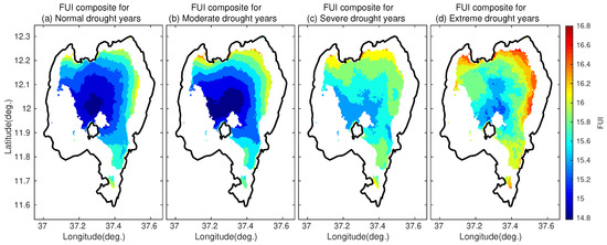 Seasonal FUI composites of Lake Tana during below-normal, normal, and above normal normalized difference vegetation index (NDVI) months.