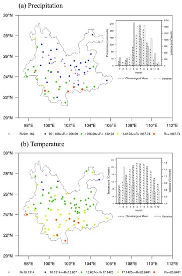 The spatial distribution of the climatological annual cumulative precipitation (a) and annual average temperature (b) at 83 in situ stations in Yunnan and the annual cycle of climatology (1991–2020) and variance (1991–2020) of the area-averaged cumulative precipitation (bar chart of (a)) and average temperature (bar chart of (b)) in Yunnan.