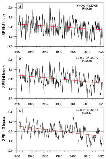 Temporal variation (black line) and trend analysis (red line) of the SPEI in Yunnan at (a) 3-month timescale, (b) 6-month timescale, and (c) 12-month timescale from 1961 to 2020.