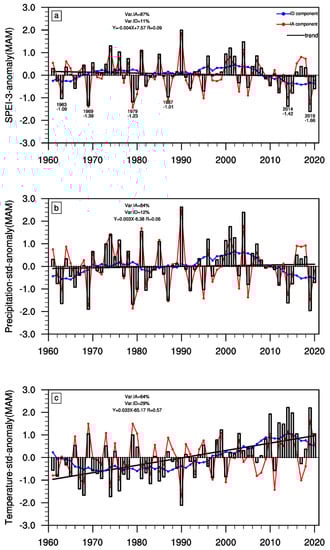 Temporal variation (black bar) and trend analysis (black line) of the (a) SPEI-3, (b) standardized cumulative precipitation, and (c) mean temperature anomalies in spring from 1961 to 2020. (Blue dotted line: interdecadal component of SPEI-3, precipitation, and air temperature; red dotted line: interannual component of SPEI-3, precipitation, and air temperature).