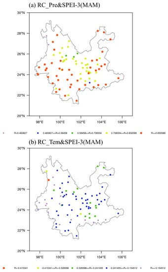 The spatial patterns of the precipitation and temperature contributions to SPEI-3 on the interannual timescale are displayed in Figure 6. The contributions of precipitation and temperature to the spring SPEI-3 can be represented by the standardized regression coefficients of the multiple linear regression [65,66]. As shown in Figure 6a, the precipitation standardized regression coefficients are greater than 0.8 at most stations, excluding a few stations in central Yunnan. In southern and western Yunnan, the temperature standardized regression coefficients are greater than −0.15, and those of other stations are between −0.15 and −0.25 (Figure 6b). It should be noted that the standardized regression coefficient of temperature at the Fu-gong station, which is located in northwestern Yunnan, is higher than that of precipitation. This may be related to the local climate characteristic of abundant spring precipitation in this region, which leads to the low sensitivity of SPEI-3 to precipitation [66]. Furthermore, the topographic characteristics of Yunnan play an important role in the magnitude of the contribution of precipitation. The contribution values of precipitation in the southern region (low altitude) are generally higher than those in the northern region (high altitude), while the contribution of temperature is smaller in low-altitude regions, such as western and southern Yunnan. The uneven distributions of the standardized regression coefficients further indicate the diversity and complexity of the causes of the SDY.