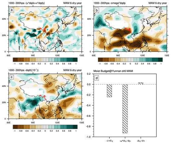 Adequate moisture and ascending motion are essential requirements for rainfall formation [67]. A vertically integrated moisture budget was diagnosed to identify the specific physical processes that cause the interannual precipitation anomalies in the spring drought years in Yunnan. As shown in Figure 7a, the horizontal moisture advection term shows a negative value over most areas of Yunnan, which indicates that the water vapor entering Yunnan from the horizontal direction is notably less than normal. In Figure 7b, the significant negative vertical moisture advection illustrates that the suppressed ascending motion, which is unfavorable for precipitation, is mainly located in Yunnan, the BOB, and the South China Sea (SCS) and its surrounding areas. In addition, a positive q tendency exceeding the 95% confidence level covers the region from the east coast of the Arabian Sea to the Yunnan area, with the center located in the northern BOB (Figure 7c). The order of magnitude of the q tendency is much smaller than those of the horizontal and vertical moisture advection; thus, its contribution can be ignored. As the terms of both the horizontal and vertical moisture advection contribute negatively to the spring precipitation in Yunnan, their contributions are quantified by calculating the regional average values. As shown in Figure 7d, the regional average values of the horizontal and vertical moisture advection in Yunnan are −0.24 kg/(m2 × day) and −0.93 kg/(m2 × day), respectively, which indicates that the suppressed vertical moisture advection is mainly responsible for the spring precipitation shortage in Yunnan.
