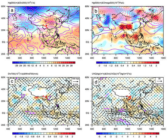 Composite horizontal distributions of anomalies of (a) 200 hPa geopotential height (shading, m) and divergence (contour, 10−6 s−1), (b) 500 hPa geopotential height (contour, m) and vertical velocity (shading, 10−2 Pa/s), (c) 700 hPa wind (vector, m/s) and divergence (shading, 10−6 s−1), and (d) 1000–300 hPa integrated water vapor flux (vectors, kg/(m × s)) and its divergence (shading, 10−5 kg/(m2 × s)) in spring drought years (black dots and purple vectors indicate significance at a 90% level, determined using t-test).