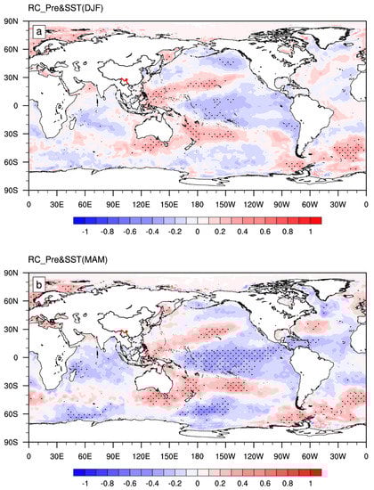 Composite horizontal distributions of standardized regression coefficients of (a) Yunnan spring precipitation anomalies and global pre-winter sea surface temperature anomalies (SSTAs) and (b) Yunnan spring precipitation anomalies and global spring SSTAs (dotted areas are the regression coefficients that are significant at the 95% level, determined using t-test).