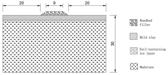 In this paper, the measured parameters of soil in the Beiluhe area of the Qinghai–Tibet Plateau [35] were selected, and the mass content and water content of NaCl and Na2SO4 in soil [33] were used as variables. Considering the crystallisation of salt and the influence of salt on the freezing temperature of active layer soil, the numerical calculation of water, heat and salt in saline frozen soil was carried out. The subgrade model is as shown in Figure 1: The height of the subgrade is 2 m; the slope is 1:1.5; the natural ground on both sides is 20 m, and the thickness of the soil layer below the subgrade is 30 m. Both sides of the model are thermal insulation boundaries. The soil parameters are shown in Table 1 and Table 2.