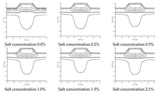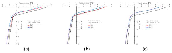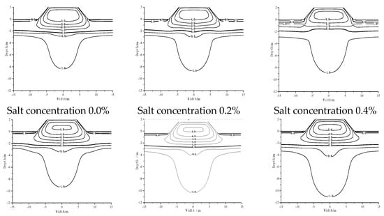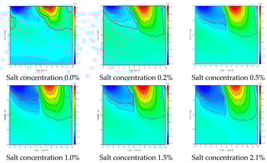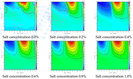 As shown in Figure 3, non-salt roadbed (salt concentration 0.0%) is due to the heat absorption of asphalt pavement, which is relative to the natural ground. The permafrost temperature below the roadbed increased, −0.5 °C isotherm decreased to −2.89 m, −1 °C isotherm increased to −8.36 m below the natural ground, forming a high temperature groove below the roadbed. With the increase in NaCl content, the isotherm moved downwards; the high-temperature area developed downwards, and the temperature of frozen soil increased as a whole. When the salt concentration was 1.2%, the −0.5 °C isotherm decreased to 1.73 m, and the −1 °C isotherm decreased to 2.66 m.