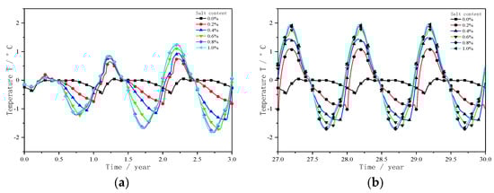 Temperature change at −1.6 m of the subgrade centre line with different sodium chloride contents. (a) Temperature change in 0–3 years. (b) Temperature change in 27–30 years.