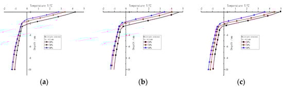 Figure 13 shows the relationship between temperature and depth on October 1 under different water contents after 30 years. As shown in the figure, the temperature of frozen soil decreases as a whole with the increase in water content. However, the temperature of frozen soil may change slightly because the freezing temperature of sodium sulphate changes nonlinearly with salt concentration. When the salt concentration is 1.0%, the temperature of frozen soil below the centre line of the subgrade decreases as a whole with the increase in water content, indicating that the increase in water content can promote the stability of permafrost. When the salt concentration is 1.5%, the temperature of 40% water content below the subgrade centre is always less than the temperature of 20% and 30% water content. However, the temperature of the active layer with 30% water content is greater than that with 20% water content, and the temperature of permafrost below the active layer is greater with 20% water content because the freezing temperatures of 20% and 30% water content are −1.3 °C and −1.7 °C, respectively, and the freezing temperature difference is 0.4 °C. In addition, the effect of freezing temperature on the active layer temperature is greater than the effect of water content increase on the active layer temperature. With regard to the permafrost, the greater the water content, the higher the latent heat of phase change that needs to be overcome for the temperature of the active layer to transfer downward. Therefore, compared with the temperature of 20% water content, the permafrost temperature of 30% water content is smaller. When the salt concentration is 2.1%, the temperature of 20% water content below the subgrade centre is always greater than that of 30% and 40% water content. However, the temperature of 30% and 40% water content is almost the same because the freezing temperatures of 30% and 40% water content are −1.3 °C and −1.6 °C, respectively. Compared with 30% water content, the freezing temperature of frozen soil with 40% water content decreases, whereas the water content increases. The effect of the two water contents on the frozen soil temperature offsets each other, resulting in almost the same temperature.