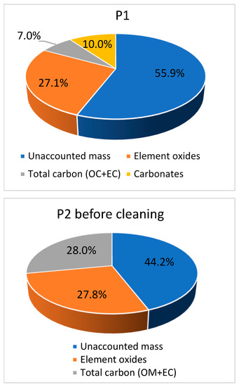 Contrary to other studies, where it was possible to reach 70–90% of mass reconstruction [64,65], the identified components reached up to 50–65% of the total PM10 mass (Figure 1). The two main factors were elements expressed in their oxidised form (Al2O3, MgO, Fe2O3, TiO2, K2O, etc.), and carbonaceous content (OM and EC). With regard to the outdoor parking (P1), elemental oxides contributed 22.8% to the total mass, whereas carbonates (CO32−) represented 6.0–12.0% of the total PM10 mass. However, the laser performance was disturbed by some metal content (mostly Fe), hindering a proper OC-EC separation and preventing it from obtaining a valid value for OC. In indoor parking lots, carbonaceous content (OM + EC) was similar to the sum of elemental oxides (ΣELEMENT OXIDES) for P2AVG (28 ± 3% over 29.1 ± 7.9%), but significantly higher for P3 (41.2 ± 3.7% over 23.6 ± 6.1%). The only exception were data from P2 after cleaning, in which case element oxides contributed to the total mass more than carbonaceous content: 34.3% (ΣELEMENT OXIDES) and 29.1% (OM + EC). Moreover, the contribution of metal oxides to the total PM10 mass in P2 after cleaning accounted for 34.3% (1.57 mg m−2) versus a lower 27.8% (20.5 ± 7.02 mg m−2). This suggests that the accumulation time needed for organic constituents might be longer than the time needed for the metal fraction to bulk up.