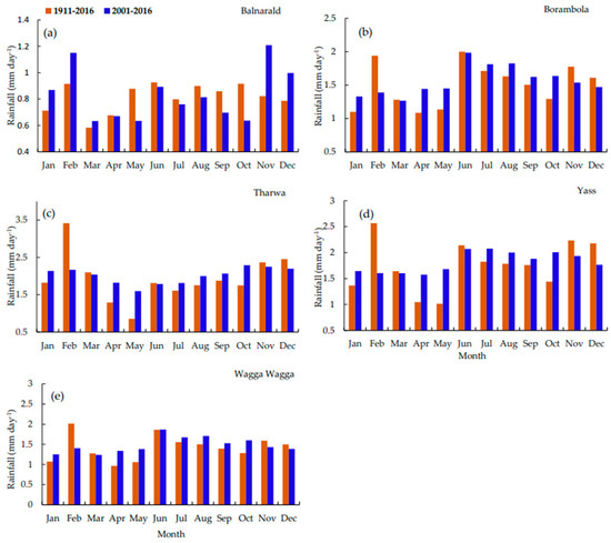 Long-term (1911–2016) and short-term (2001–016) historical average rainfall plotted against five different sub-catchments. (a) Long-term and short-term historical average rainfall at Balranald, (b) Long-term and short-term historical average rainfall at Borambola, (c) Long-term and short-term historical average rainfall at Tharwa, (d) Long-term and short-term historical average rainfall at Yass, (e) Long-term and short-term historical average rainfall at Wagga Wagga.