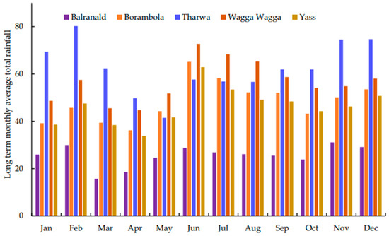 The average annual rainfall of the Murrumbidgee River catchment is about 533 mm (mean annual long-term rainfall data from Balranald, Wagga Wagga, and Yass). This annual rainfall pattern varies from 714 mm to 359 mm between the high elevated area Yass and downstream area Balranald. Most of the rainfall occurs during the winter months (May–October) in Wagga Wagga and Yass, whereas at Balranald, rainfall occurs between June and July. In comparison, long-term average rainfall (1911–2016) with the average record of the last seventeen years (2001–2016) shows autumn rainfall has increased in February by 70% at Balranald (Figure 2a), 51% at Wagga Wagga (Figure 2e), 49% at Yass (Figure 2d), 58% at Borambola (Figure 2b), and 47% at Tharwa (Figure 2c). The rainfall comparison pattern shows a higher trend in Yass and a lower trend downstream of Wagga Wagga (Figure 2e). Thus, total historical summer monthly rainfall is higher in Tharwa and lower in Balranald (Figure 3).