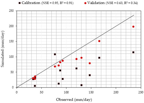 SIMHYD model performance criteria during calibration (black squares) and validation (red circles) results at Balranald sub-catchment (mm/day).