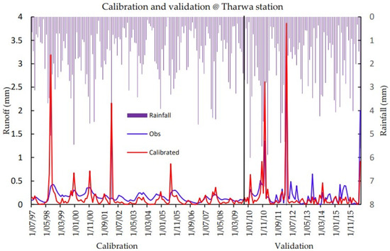 Calibration and validation give a way to assess the robustness of the model. There are different methods of model calibration, and among them, a suitably long period of runoff record is the preferred method. This method helps to verify the model behavior outside the calibration period. It is important to select the calibration and validation periods carefully to cover both wet and dry extremes, and the average annual flow is statistically insignificantly different from the validation period. In this study, the SIMHYD was calibrated against the monthly streamflow data (Figure 4) for a period of fourteen years (1997–2010); two years used for warmup and twelve years for calibration SIMHYD model. Moreover, the model was validated over five years (2012–2017). Both the calibration and validation were done at Balranald station, which is the outlet of the Murrumbidgee River basin. The SIMHYD was calibrated against the daily runoff data for a period of fourteen years (1997–2010), including two years of warmup that covered both extreme wet and dry flows. Moreover, the model was validated with five years of data outside of the calibration period (2012–2017). Both the calibration and validation processes were done at Balranald Station, which is the outlet of the Murrumbidgee River basin. The performance of our hydrological model to simulate the catchment hydrology is measured using the Nash-Sutcliffe Efficiency (NSE) and RMSE [44]. NSE values vary from zero to one. The closer the NSE value is to one, the greater the model’s performance. However, NSE values greater than 0.6 indicate acceptable model performance, and NSE values greater than 0.8 indicate good model performances [24,44,45]. Similarly, an RMSE value near zero shows high model performance.