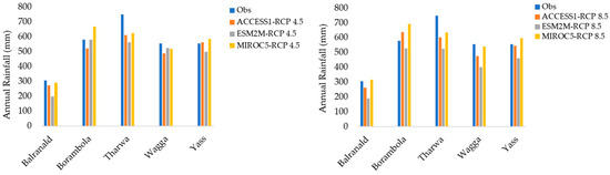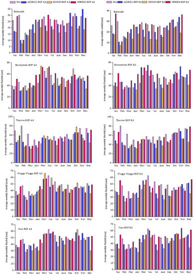 This section presents the results of rainfall analysis done by comparing historical observed rainfall for the period 1985–2016 with projected rainfall under emission scenarios RCP 4.5 and RCP 8.5 at five different sub-catchments. The analyses were done for annual, monthly, and seasonal changes, respectively, at each station. The analyses show that the ESM2M climate model underestimated the average monthly rainfall in all sub-catchments except for May under both climate scenarios. Applying the same analysis, ACCESS1 underestimated the monthly rainfall over five sub-catchments in the study region during January, February, and March under RCP 4.5 and RCP 8.5 climate scenarios. However, the ACCESS1 climate model overestimated and underestimated the monthly rainfall at five different sub-catchments in the Murrumbidgee River catchment. Exceptionally, for the two climate models, MIROC5 overestimated the monthly rainfall over all sub-catchments in the Murrumbidgee River catchment under both climate scenarios compared to the rainfall in the baseline (historical) (Figure 7).