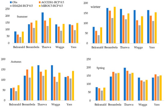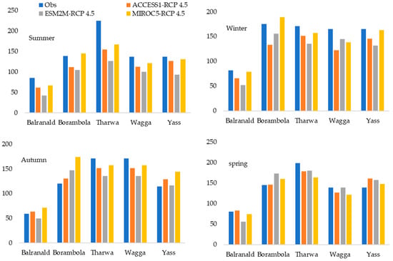 Likewise, annual and seasonal rainfall over five different sub-catchments were analyzed, and the summarizing result is shown in Figure 8 and Figure 9. Except for Borambola and Yass, all climate models projected that the annual rainfall would decrease over the Balranald, Tharwa, and Wagga Wagga sub-catchments under RCP 4.5 and RCP 8.5 climate scenarios compared to the historical rainfall at each sub-catchment (Figure 8). The summer rainfall is underestimated by all climate models under RCP 4.5 over all sub-catchments. Similarly, all climate models under RCP 8.5 underestimated the summer season rainfall over Balranald sub-catchment. Whereas the autumn, winter, and spring rainfall shows that underestimated over most sub-catchments except for Borambola sub-catchment (Figure 9 and Figure 10) under RCP 4.5 and RCP 8.5 climate scenarios.