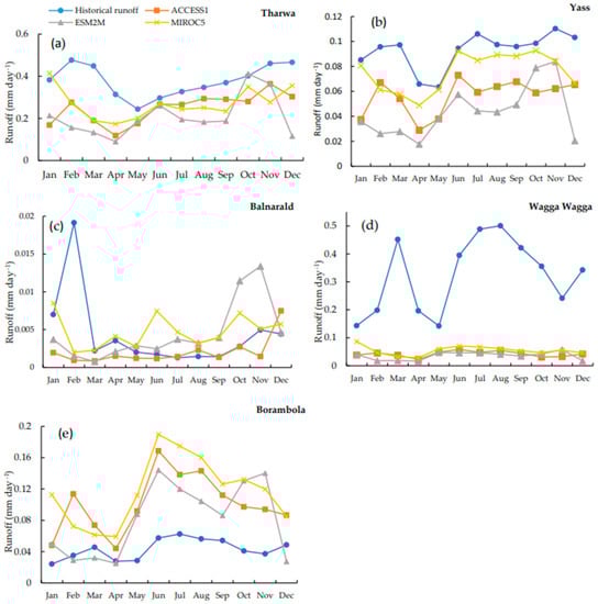 The average monthly projected and historical observed runoff trend under the RCP4.5 climate scenario at five different sub-catchments within the Murrumbidgee River catchment. Three GCMs projected future runoff trends under the RCP4.5 climate scenario for period of 2016–2035 plotted against observed historical runoff at five different sub-catchments; a) projected and historical runoff at Tharwa, b) projected and historical runoff at Yass, c) projected and historical runoff at Balranald, d) projected and historical runoff at Wagga Wagga, e) projected and historical runoff at Borambola.