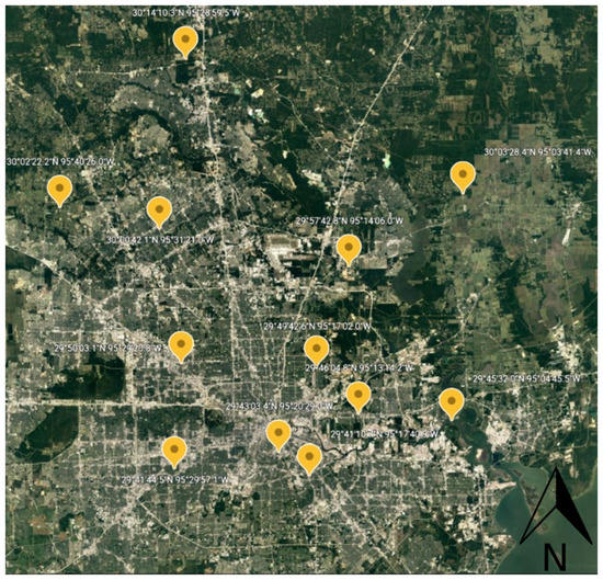 The data used for training and testing the proposed model were acquired from the Houston metropolitan area, provided by the Texas Commission on Environmental Quality (data acquired from https://www17.tceq.texas.gov/tamis/index.cfm, accessed on 1 December 2022). This site was chosen since it is a major urban area with an important industrial and economic center, hosting large oil refineries and petrochemical industries in the North American region [52,53]. Due to its highly populated area and economic activities, this region is often classified as non-attained by the Environmental Protection Agency (EPA) for the US. This means that Houston does not comply with the National Ambient Air Quality Standards (NAAQS) for air pollutant concentrations [52,53,54]. For the present work, data from monitoring stations were used. The historical data comprise the period from 2011 to 2019 and has hourly information for concentrations of ozone, NO2/NOx, the VOCs propane, isobutane, benzene, toluene and ethylbenzene. This research supplemented the pollutant information with weather data such as wind speed, wind direction, outdoor temperature, relative humidity and solar radiation. A map of the studied region and its stations is presented in Figure 1.