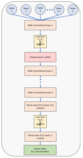 Figure 4 shows how the input spatiotemporal data from the nodes are fed to the model, passing through successive convolutional, dropout layers and leaky ReLU activation functions. After four repetitions, the output data are then sent to be processed by a dense layer, where they will finally return the predicted value for ozone concentration by its output layer.