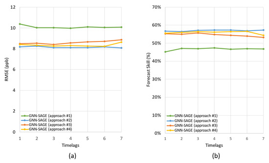 In pane (b), the Forecast Skill values for each approach show that approach 4 indeed leads to more significant improvement for ozone forecasting. Such an approach improved the model’s accuracy over the persistence model to a maximum of 34%. Visualizing Figure 6b, it is possible to see that, once again, GraphSAGE using approach 1 had the worst performance and approach 3 worsened for further forecasting horizons.