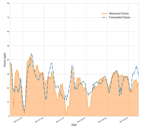 From Figure 7, it is shown that the graph model can identify ozone peaks during the assessed period, an important feature in checking EPA compliance. It also followed closely the actual data trend over the period, indicating good overall performance. This can be better visualized in Figure 8, where the measured and forecast ozone levels, in ppb, are compared with each other. The histograms in Figure 8 represent the frequency of the statistical probabilistic distribution for the assessed values of ozone, in ppb unit.