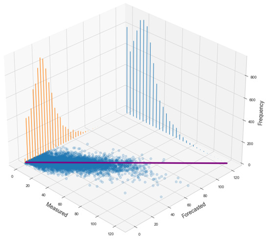 As previously stated, as expected, the model’s performance was inferior to the one for the 1 h forecast horizon. Figure 11 shows that for the 3 h ahead horizon, there is still good agreement between real and forecast ozone concentrations, but the points are more dispersed over the plot area. This sparser distribution leads to higher RMSE and lower R2, which reached the respective values of 6.45 ppb and 0.84.
