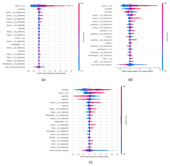 From Figure 15, the most influential attribute for (a) and (b) is the past hour’s information of ozone data from the reference station, indicated by “Ozone_L(1)”, while in pane (c) the variable “sin(HoD)” takes the lead as the most influential. The importance of the HoD variable for ozone prediction is due to its cyclic nature, reaching maximum values during daytime due to photochemical reactions, and minimum values during nighttime due to deposit and elimination processes [72,73]. Data from the previous 1 h information for ozone concentration, e.g., “Ozone_L(1)”, have a strong influence over the model’s performance, indicating that information from further in the past adds little to future estimations due to its volatile behavior. It is also visible that past ozone information coming from stations other than the reference one, e.g., “Ozone_L(1)_Station(1)”, also plays an important role in the model’s predictive performance. For all forecasting horizons, ozone concentration from surrounding stations is always present on the top part of the SHAP plot, indicating a strong influence over the model.