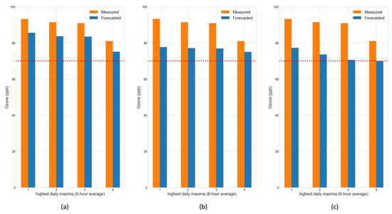 To further assess the proposed GraphSAGE performance, the present work also considered EPA regulations concerning ozone levels in the atmosphere. The EPA states that a region is non-attained when the fourth-highest daily value for the daily maximum 8 h average of a 3 consecutive year average surpasses the threshold of 70 ppb. To verify the station’s compliance to EPA regulations through GraphSAGE assessment, one year of data was used instead of the three consecutive years. The motivation behind this change was that more precise and detailed results from the graph model were desired and the three-year period average would lead to the same results as if measured yearly. The results for this analysis are presented in Figure 16, where the dotted red line represents the 70 ppb limit.