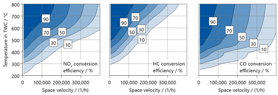 An essential part of a precise emission simulation is the correct modeling of the exhaust aftertreatment components. During the development of the RDE emission simulation methodology, it was identified that, initially, three-way catalysts could rarely be modeled with sufficient precision. For a precise prediction of the emissions under RDE boundary conditions, knowledge of the conversion rate at highest space velocities and in a wide temperature range is of interest. As a result, a unique piece of equipment was developed in [19] that can be used to characterize catalysts under exactly these conditions. The system is designed and proven for exhaust gas mass flows up to those produced by turbocharged V12 engines. The exhaust gas temperature can be cooled down to temperatures below the catalyst light-off temperature at the highest mass flows. Even under stationary engine conditions with constant engine-out emissions, this makes it possible to measure the conversion efficiency at the highest exhaust gas mass flows and cold exhaust gas temperatures, such as they can occur in a full load acceleration shortly after an engine start [19]. The result of the corresponding tests are catalyst efficiency maps, as depicted in Figure 2. The entire RDE-relevant area is covered. The exemplarily Euro 6d-TEMP catalyst shows a significantly reduced conversion rate for all components at high space velocities at stoichiometric air/fuel ratio. NOX emissions can usually be kept under control during RDE by a calibration that deviates slightly from Lambda = 1 into the rich area, which maintains a good conversion of NOX even at high space velocities. Bigger catalyst volumes are also necessary to comply with such limits when operating in the whole engine map at Lambda = 1.