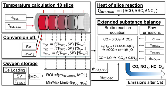 The core of the TWC model is the conversion efficiency based on the empirical maps generated with the methodology described previously. These maps are measured at stoichiometric air–fuel ratio, where the optimal conversion efficiency of CO, HC and NOX is achieved [36]. For deviations of the stoichiometric operation, an oxygen storage model is used. The oxygen model can be described as a flexible container with the maximum oxygen load (MOL). The MOL is dependent on the current catalyst temperature TCat, the Ceria loading Ce and space velocity SVCat; characteristic maps have been empirically determined based on test bench measurements. The available oxygen present in the exhaust gas is ṁO2,raw and the ais compared with the O₂ required for the reactions with CO and HC, ṁO2,ox (excluding the reaction of NOX with CO and HC). If there is a lack of or significant excess of oxygen, the map-based conversion efficiency is corrected based on the extended substance balance using simplified Brutto reaction equations. Finally, the heat flow of the exothermal reactions is fed back to the temperature model, where a radial and axial discretized slice approach is used to determine the catalyst temperature in spatiotemporal resolution.