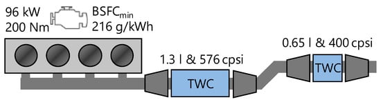 Two three-way catalysts are responsible for exhaust gas aftertreatment. The first close-coupled TWC has a cell density of 576 cells per square inch (CPSI) and a volume of 1.3 L. The distance to the exhaust valves ranges from 550 to 640 mm.