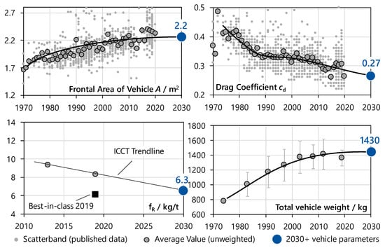 As CO₂ reduction and fuel efficiency are the focus of development efforts, a decrease in the aerodynamical drag coefficient due to optimized exterior design is expected. Additionally, the tire friction is reduced by fitting smaller width, best-in-class friction tires [39]. On the other hand, increasing comfort requirements have led to bigger and heavier vehicles in the past. This trend is expected to be countered by energy efficiency calls for lightweight construction and materials, so that the total vehicle weight could stagnate [38]. The characteristic parameters that were finally chosen for the 2030 vehicle are highlighted in blue in Figure 5.