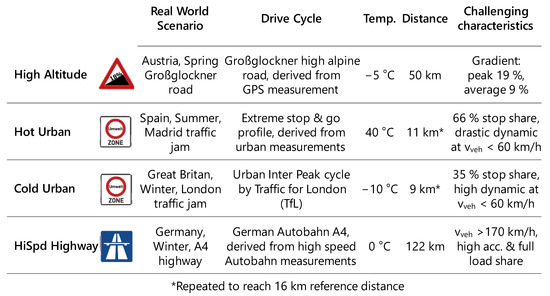 The cycles were selected based on an extensive project discussion to include representative cases that are challenging from all relevant technical aspects. This includes both cold and warm conditions, urban stop-and-go and high-speed highway driving. The cycle traces can be found in the Appendix A of this paper.