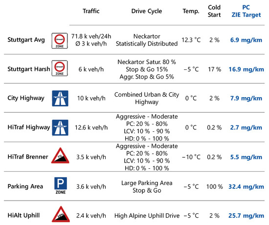 In the corresponding project by Hausberger et al. [44] for the FVV e.V., a 3% irrelevance threshold was defined for “Zero-Impact traffic contribution” to local air quality. With this approach, the emission factors that the vehicles may emit depend highly on the boundary conditions, and there is no fixed emission limit. Based on this, a universal methodology was developed that transfers ZIE levels to individual boundary and environmental conditions [17]. Different scenarios were derived from real-world situations that are both critical in terms of air quality and pollutant emissions. For each scenario, the parameters are described in detail in [17] and the cycle data are publicly available [45]. The boundary conditions and the individual emission target for the passenger cars are summarized in Figure 7.