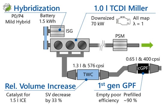 In a first step, emission features are implemented that are expected to be mandatory to achieve any emission legislation in 2030+. This includes the implementation of a gasoline particulate filter (GPF) with a filtration efficiency of 90%, integrated in the underfloor (UF) with a catalytic coating (four-way catalyst). The coated GPF (cGPF) is prefilled with soot and ash, which increases the filtration efficiency significantly [26]. While full-load enrichment is tolerated in EU6 legislation as an auxiliary emission strategy, this will probably change for upcoming legislative steps, as operations including high-load constant driving (e.g., trailer operation with high gradients) should be included [10,11]. Therefore, the engine must be operated with a stoichiometric air/fuel ratio in the whole operation range. Technology options to enable this such as integrated exhaust manifold or high temperature turbines are discussed in detail in [19]. With the European green deal and the resulting CO₂ reductions agreed in the Fit for 55 package [50], the reduction in fuel consumption is expected to be particularly focused on the high-volume C-segment. Therefore, the engine is downsized to 1.0 l and a P0/P4 mild hybridization is added.