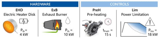 A major trend in future emission reduction is the installation of an additional heating device such as an electric heater or additional fuel burner [29]. Electrical heating is typically applied by introducing an electrical heater disk (EHD) in front of the catalyst, either as a self-supporting structure [54] or coupled to a small TWC support brick [28,55]. The exhaust fuel burner (ExB) uses the thermal energy of a separate combustion to heat up the exhaust system directly. Other than the EHD, only auxiliary electrical energy is needed and is therefore mainly independent of the vehicle electrification. A 12 V bord net is sufficient to power the low-pressure fuel pump, secondary air, injection and ignition of the burner system. For a 20 s operation at 13 kW, about 0.007 l gasoline is needed [56]. However, since fuel is burned, raw emissions occur during operation while the catalyst is still cold and are therefore not converted [30,56]. For example, the applied burner emits 4.5 mg HC, 30.6 mg CO and 7.1 mg NOX in 15 s of operation.
