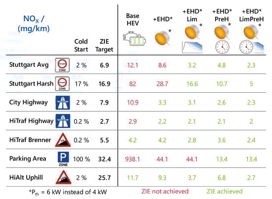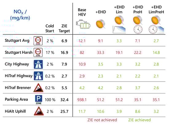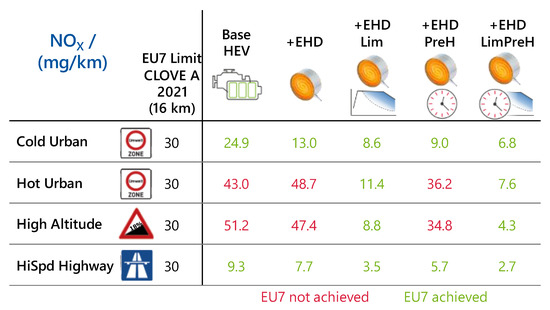 The variants with an EHD are investigated first. The results for the four challenging Euro 7 scenarios are shown in Figure 10.