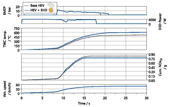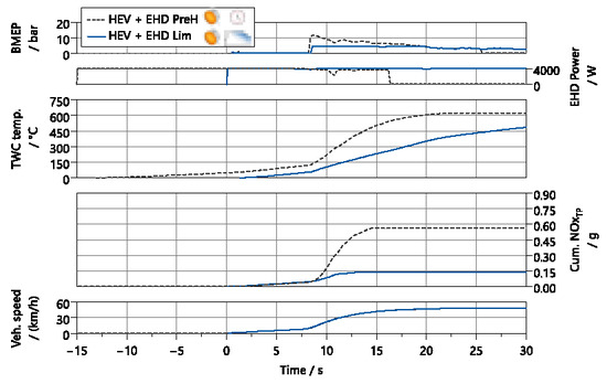 The cycle is characterized by an acceleration with high ICE load demand up to BMEP = 12 bar, starting from t = 8 s. The electrical heating does not increase the temperature fast enough to effectively heat up the exhaust gas and TWC. The benefit of adding an EHD is therefore minor. In the case of an even earlier or more intense acceleration, the EHD can also increase tailpipe emissions, as the additional thermal inertia of the disk slows the heat-up of the catalyst. This is the case for the Hot Urban cycle. To exploit the full potential of the EHD, the heating needs to be operated for some time before a high raw emission mass flow. This is possible by either operating the EHD before the ICE start (pre-heating) or by limiting the ICE power and thus the incoming raw emission mass flow. Both options are combined with the EHD in Figure 12.