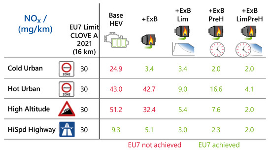 The analyses showed that NOX is the most critical to achieve, hence the focus of the paper. For CO emissions, adaptions of the catalyst regeneration strategy were necessary in the Cold Urban cycle due to very frequent changes in the ICE load. For a CO-critical layout, it is beneficial to avoid catalyst regeneration completely, e.g., by shutting off the exhaust valves during ICE stalling or shut-off. Possible technologies and their benefits are discussed in the recent literature [60,61].