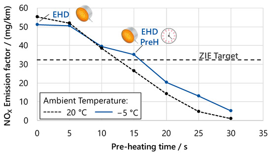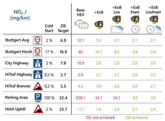 Since the exhaust burner has a heating power of PExB = 10 kW instead of only PEHD = 4 kW for the EHD, the emission reduction is much more significant when only adding the burner. Compared to the EHD performance in Figure 14, the burner additionally reduces emissions up to 55% (Stuttgart WC). Without additional control measures, the exhaust burner is already able to achieve all scenarios except for the Parking Area. This demonstrates the high impact of the heating power. The additional pollutant emissions of the ExB are negligible compared to the benefit of the additional exothermal output. To achieve the Parking Area scenario, an additional pre-heating time is necessary. With the 15 s implemented in the ExB PreH option, the emission factor is already 90% below the ZIE target. A minor pre-heating time, e.g., of 5 s, would already be sufficient here.