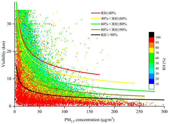 | RH | Fitting Equation | Correlation Coefficient | Threshold (ųg/m3) | Mean VIS (km) | Percentage (%) |