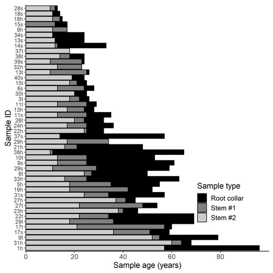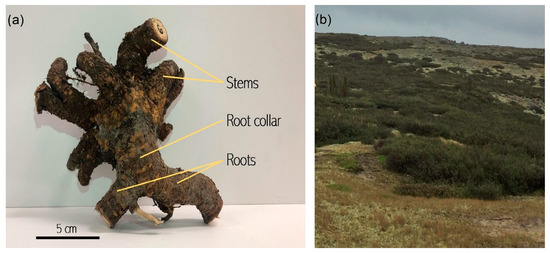- Ropars, P.; Angers-Blondin, S.; Gagnon, M.; Myers-Smith, I.; Lévesque, E.; Boudreau, S. Different Parts, Different Stories: Climate Sensitivity of Growth Is Stronger in Root Collars vs. Stems in Tundra Shrubs. Glob. Change Biol. 2017, 23, 3281–3291. [Google Scholar] [CrossRef]
