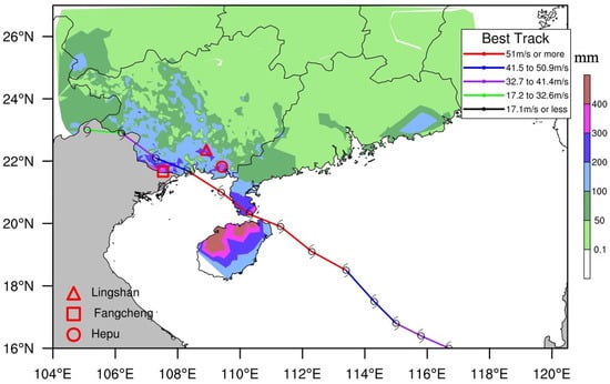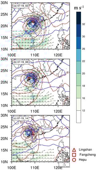 Note that Rammasun caused four rainstorm centers over South China (Figure 1), including one (i.e., Changjiang) in Hainan and three (i.e., Hepu, Fangcheng, and Lingshan) in Guangxi. In spite of much attention from previous work, there still remained some issues to be elucidated. Firstly, previous studies mainly focus on the TC intensification [] and its induced rainfall in Hainan, while the inland extreme precipitation only gained little attention, which was the primary motivation for this study. In fact, both objective numerical and subjective manual forecasts largely underestimated the intensity of the Hepu and Fangcheng rainstorms, and even omitted the Lingshan rainstorm. Secondly, the major differences among these three rainstorms or between them and that occurred in Hainan are yet to be elucidated. The demand has thus risen for an in-depth analysis of these distinct events, which should provide important implications for improving forecasting skills. Thirdly, the numerical forecasts for heavy precipitation should be subject to manual correction, in which the concept models with distinct regional characteristics should play an important role []. Therefore, there is a high necessity to propose conceptual models to conclude the triggering and maintenance mechanisms under the affecting large-scale circulations for the rainstorms individually.