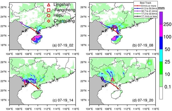 Figure 2 presents the geographic distribution of 6-hour precipitation in South China from 20BST 18th to 20BST 19th July in 2014. When Rammasun struck the Leizhou Peninsula as a super typhoon (Figure 2a), it brought about severe land rainfall mainly distributed over the Leizhou Peninsula and most of Hainan, with the maximum precipitation reaching 363.3 mm (Changjiang station) on the southwest of its moving path. When entering the Beibu Gulf (Figure 2b), Rammasun still maintained its strength as a super typhoon. Correspondingly, the rainband was mainly located on the east, north, and southwest sides of the typhoon, with the maximum shifting to Hepu station (282.7 mm). Then, it made landfall in Guangxi as a severe typhoon (Figure 2c), and caused heavy rainfall on the northwest side of its center, with the maximum located at Fangcheng station (232.9 mm). Eventually, the TC proceeded into the decay stage (Figure 2d) due to the reduced energy and surface friction during the continued northwest movement. Meanwhile, the maximum precipitation moved to Lingshan station (228.6 mm) within the east peripheral rainband. In particular, the aforementioned three stations in Guangxi were identical to the three rainstorm centers successively caused by the TC (Figure 1). Consequently, this study selected these three stations as the representatives of the corresponding rainstorms.