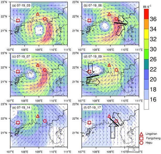 A TC rainstorm is commonly closely related to a LLJ [,], which can transport water vapor and accumulate the convective instability energy via heating and humidifying the lower troposphere, both of which contribute to the occurrence and maintenance of the heavy rain. Prior to landfall (Figure 5a), there was a strong southerly jet on the east side of the TC, with the maximum magnitude exceeding 36 m s−1. Coincidently, the Hepu station was located in the northeast quadrant of the TC’s center. As the TC moved northwest, the front of the jet core was approaching, and formed an obvious convergence over Hepu (Figure 5b).