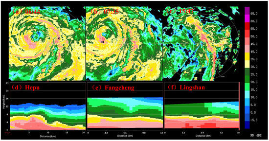 The horizontal distributions (at 1.5° elevation) and cross sections of radar reflectivity (dBZ) from Doppler weather radar at the peak of three rainstorms centered at (a,d) Hepu, (b,e) Fangcheng, and (c,f) Lingshan.