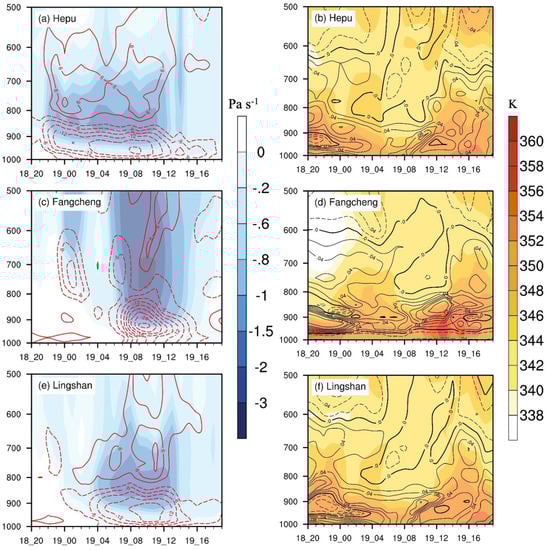 Left panels (a,c,e): the time–pressure cross sections of the area-averaged (1° × 1°) vertical velocity (shadings, Pa s−1) overlaid with divergence (contours, 10−5 s−1) from ERA5 for three rainstorms centered at Hepu, Fangcheng, and Lingshan. Right panels (b,d,f): the same except for equivalent potential temperature (shadings, K) overlaid with its corresponding gradient (contours, K Pa−1).