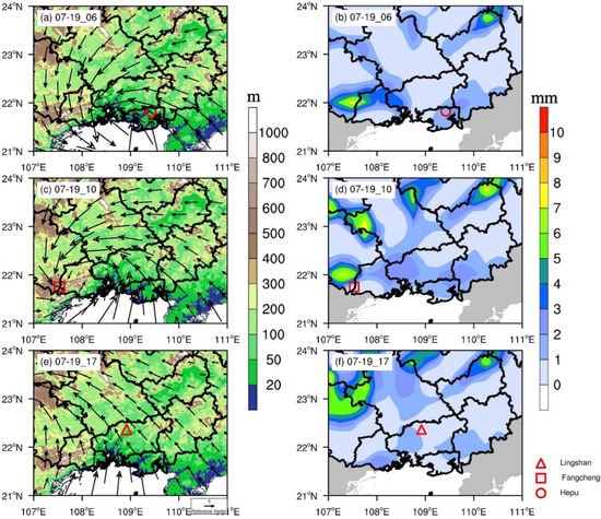 Left panels (a,c,e): the geographic distributions of terrain heights (shadings, m) overlaid with 10 m wind (vectors, m s−1) at the peak for Hepu, Fangcheng, and Lingshan rainstorms with the red markers denoting the rainstorm centers. Right panels (b,d,f): the corresponding diagnosed hourly orographic precipitation (mm) using ERA5.