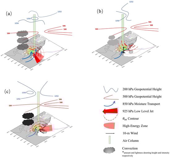 Schematics of conceptual models for (a) Hepu, (b) Fangcheng, and (c) Lingshan rainstorms caused by TC Rammasun.